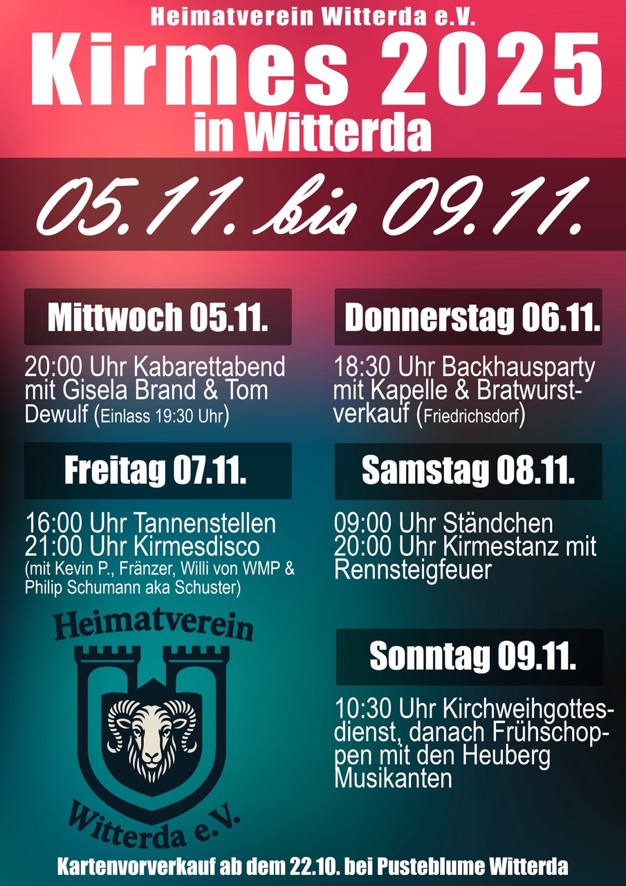 Witterda feiert in dieser Woche Kirmes und rundet damit den Reigen der Traditionsveranstaltungen in unseren Orten ab. Am Mittwoch, 5. November, eröffnet ein inzwischen gute Tradition gewordener Kabarettabend die Kirmeswoche. Gisela Brand – ein echtes Erfurter Urgestein – und Tom Dewulf bieten eine humorvolle Darstellung.