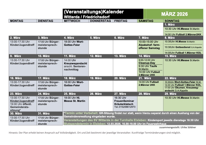 Die aktuellen Veranstaltungen im März in Witterda und Friedrichsdorf können Sie der nachstehenden Übersicht entnehmen.