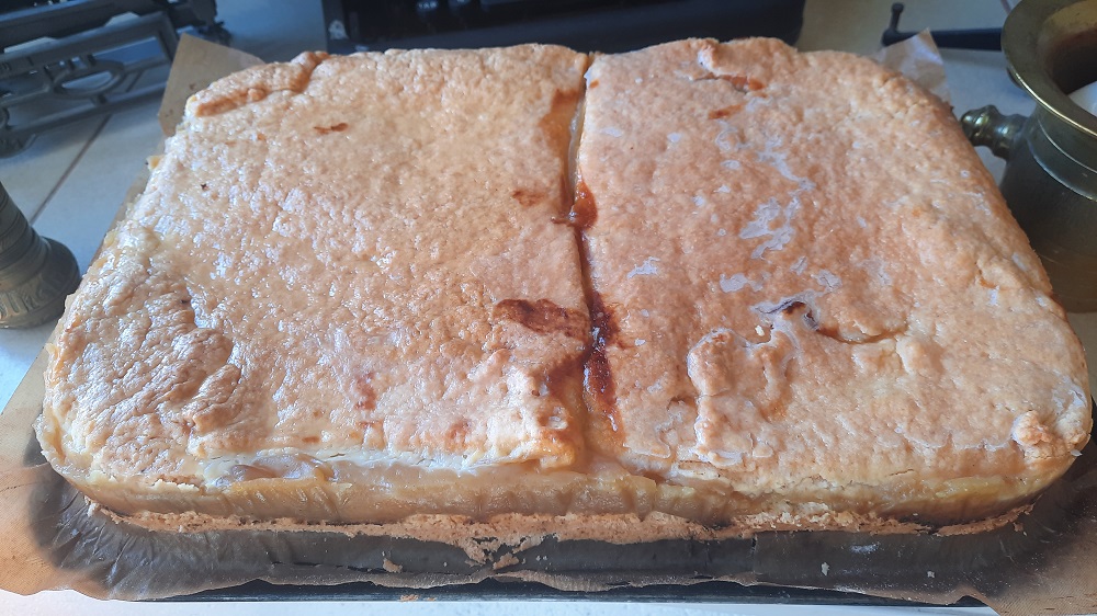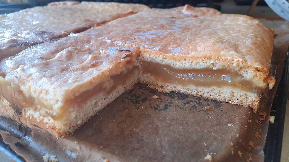 Teig halbieren, dünn ausrollen, einen Teil in eine ausgelegte Form (24cmx35cm) drücken, Apfelmus mit Speisestärke oder Vanillepudding andicken (sollte etwas dick sein), auf den Teig streichen und den 2. Teig (dünn ausgerollt) auf den Apfelmus vorsichtig legen.