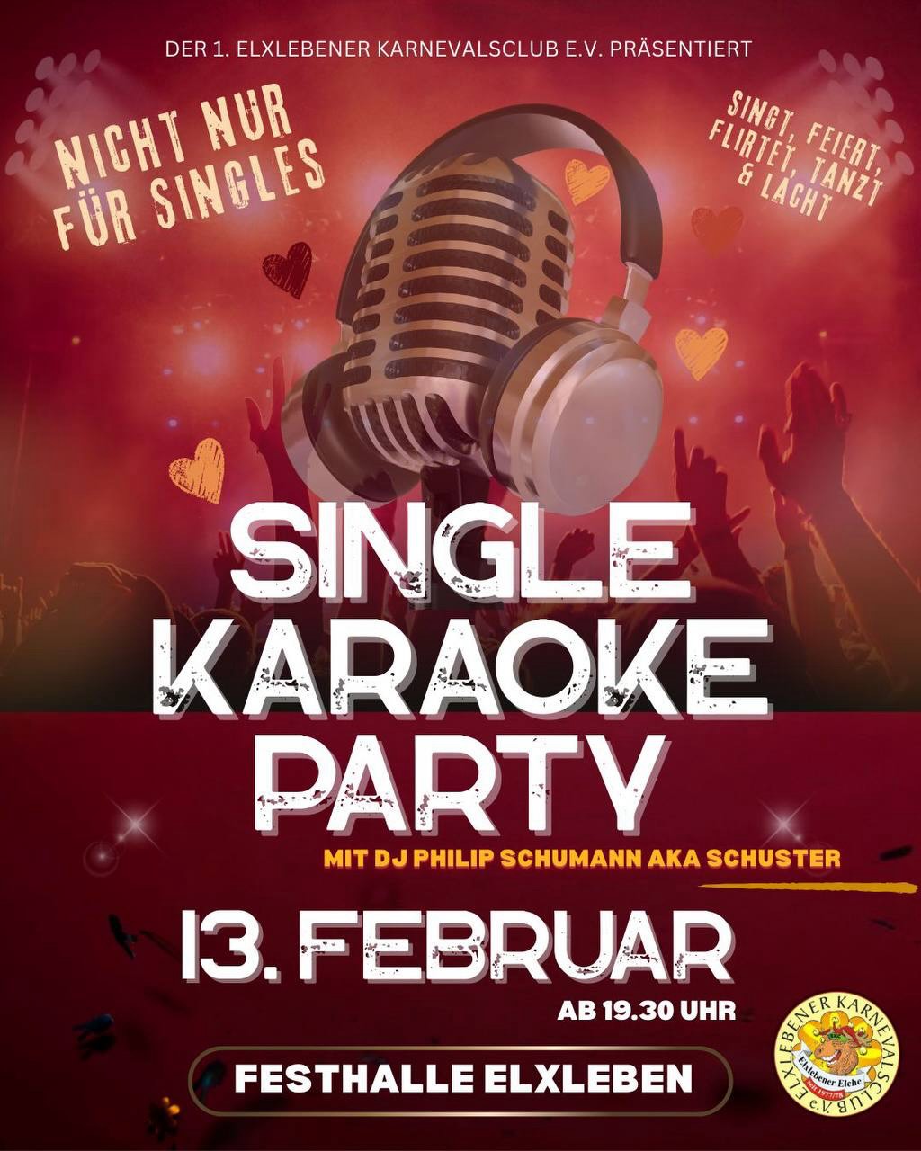 Dass der Valentinstag in diesem Jahr auf das Wochenende des karnevalistischen Höhepunktes fällt, werden die Elxlebener Närrinnen und Narren zum Anlass nehmen, eine große Portion Liebe durch die Festhalle wabern zu lassen. „Valentinstag im Narrenland – die Elche feiern Hand in Hand“ lautet folgerichtig das Motto.