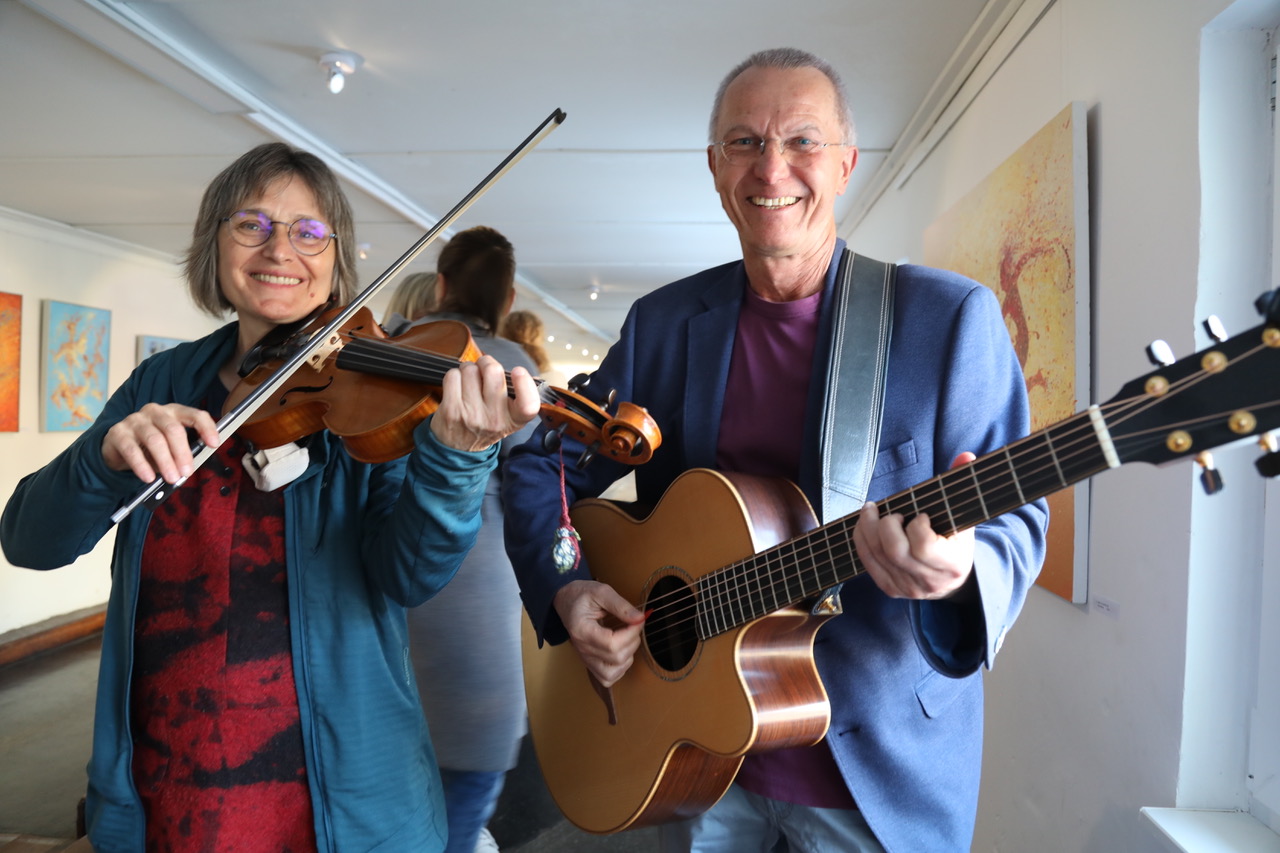 Die Kreativwerkstatt Andisleben zeichnet neben der Künstlerin für die Ausstellung verantwortlich. Das Duo Maroni aus Erfurt umrahmte die Veranstaltung mit irischen Klängen – Violine, Gitarre und Gesang.  Noch bis zum 8. August ist die Ausstellung zu sehen, jeweils freitags von 15 bis 17 Uhr oder nach individueller Terminvereinbarung.