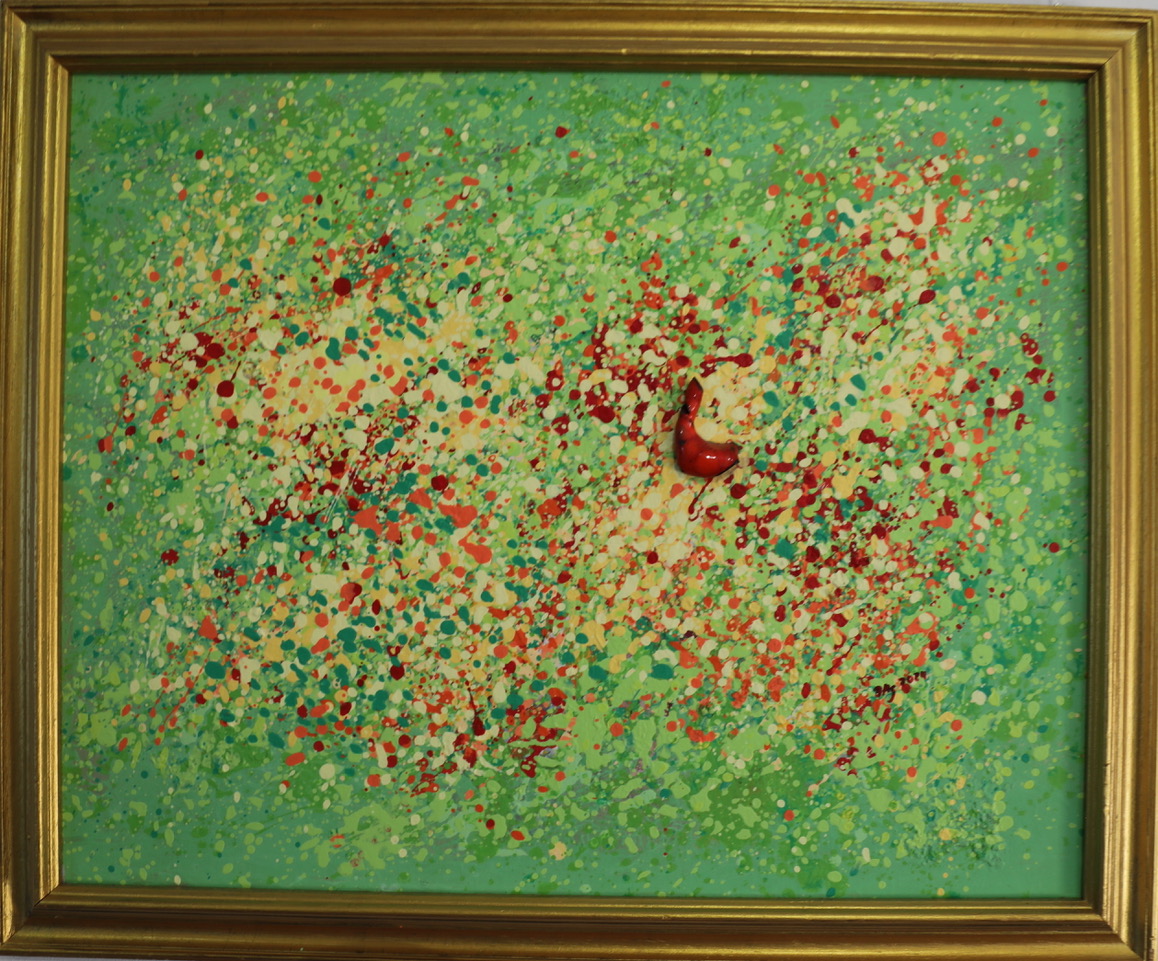 Eine Besonderheit der ausgestellten Werke ist die gelungene Verbindung von Bild und Skulptur. Kleine Meisterwerke aus emaillierten Kupfer fügen sich in die Bilder ein, setzen besondere Akzente.