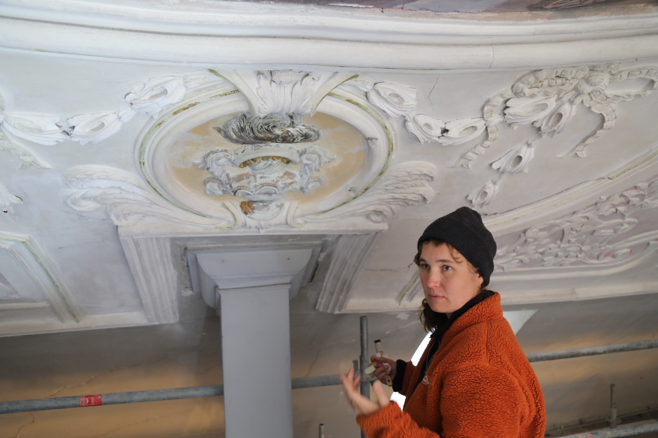 Restauratorin Marie Graubner zeigt die Risse und Beschädigungen, die behoben werden müssen.