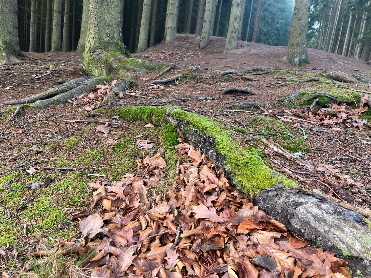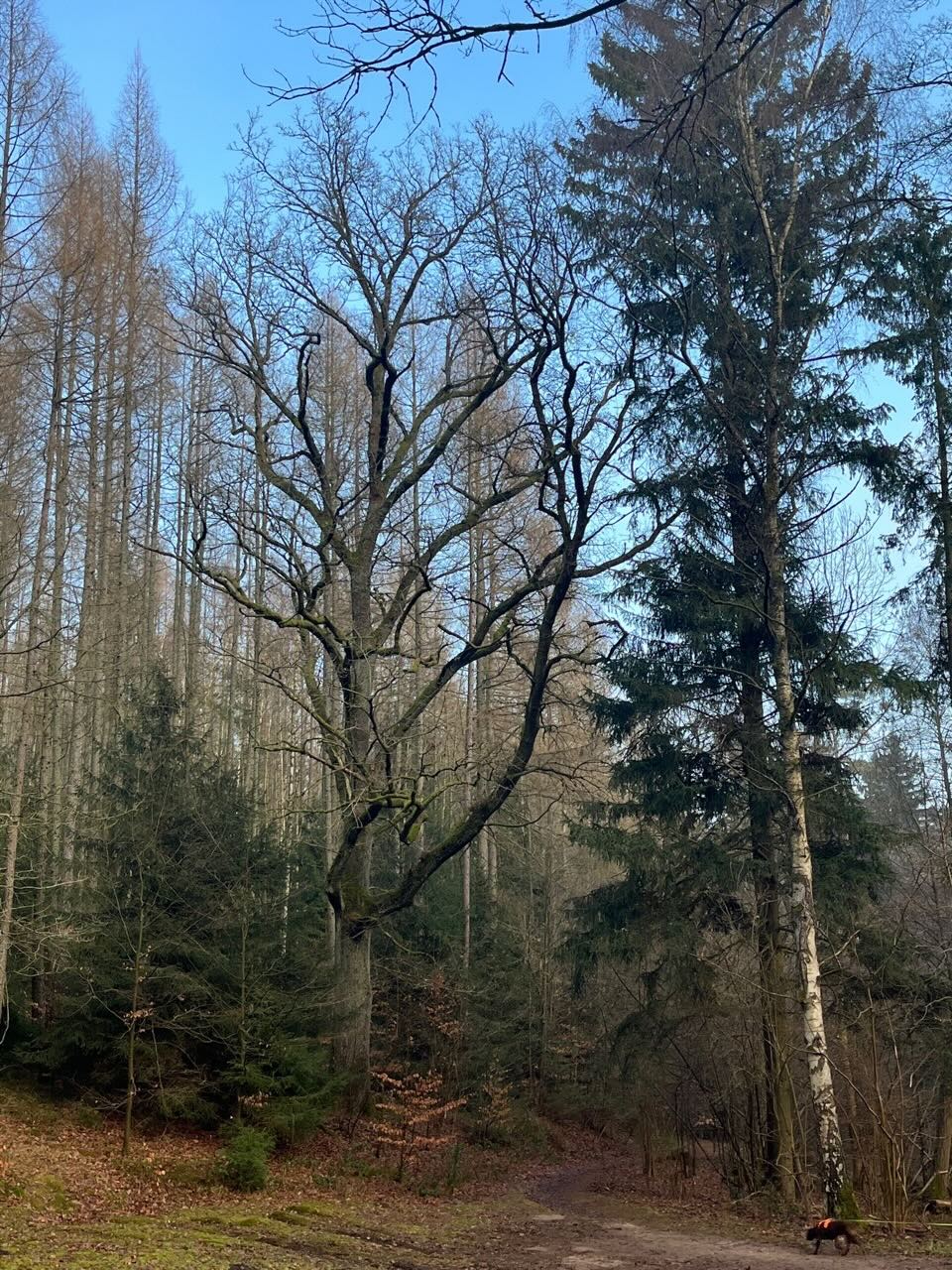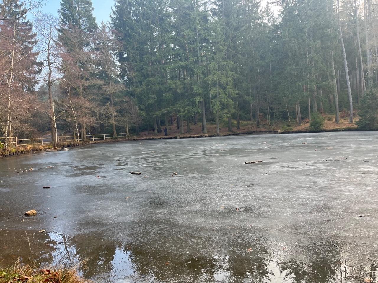 Die Wintersonne kämpfte sich erst am Nachmittag durch Nebel und Dunst und tauchte das Waldgebiet nahe Reinhardsbrunn in freundliches Licht. Der Schnee ist getaut, noch sind sie Teiche, die eine lange Fischzuchttradition haben mit einer Eisschicht überzogen.
