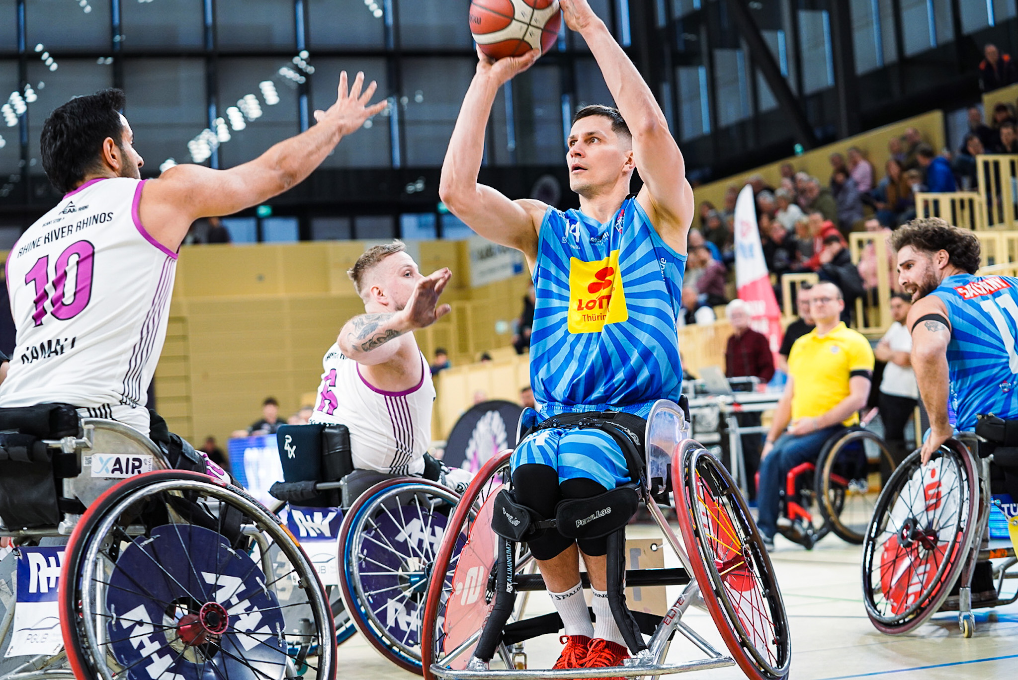 Thuringia Bulls gewinnen mit kleiner Rotation das Spitzenspiel bei den Rhine River Rhinos nach Verlängerung mit 66:59 (11:13, 14:10, 17:15, 12:16, 12:5). Das Bienek-Team reiste ersatzgeschwächt zum Spitzenspiel nach Wiesbaden. Mit Vahid Azad und Joakim Linden fehlten die beiden Topscorer des vergangenen Doppel-Wochenendes. Grund genug für Co-Trainer Jens Albrecht, sein Trikot mit der Nummer 12 wieder vom Bügel zu nehmen.