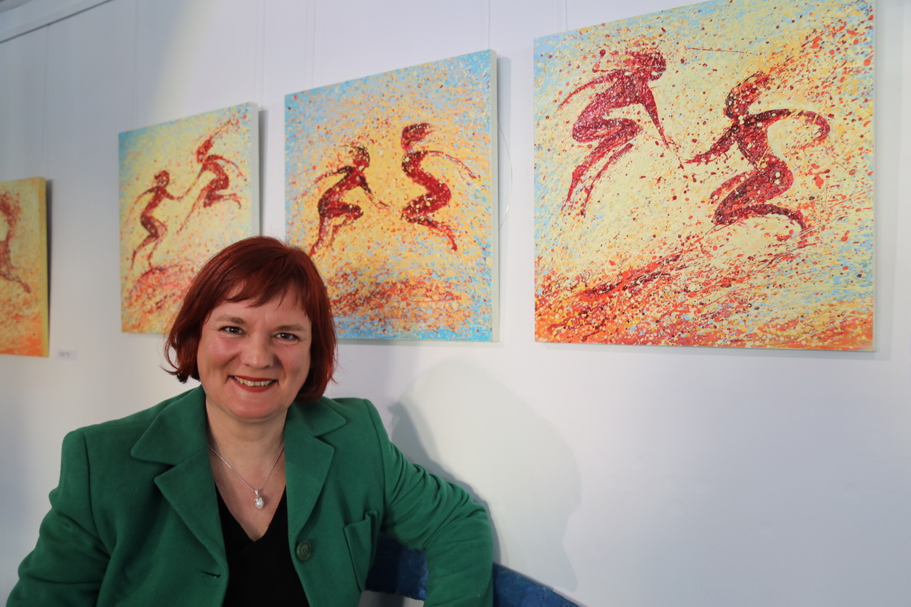 Über eine jahrzehntelange Erfahrung in Bildhauerei und Malerei verfügt die Künstlerin. Studienaufenthalte in Erfurt, Berlin, Italien, Dresden, China und Paris – Ausstellungen ebenfalls in Paris, zudem in Chicago, Hamburg, Berlin, Bonn und vielen anderen Städten einschließlich in der Erfurter Heimat prägen ihr Schaffen. „Die Reisen haben mich sehr inspiriert. Energie, Dynamik und Tanz und der Drang, kreativ zu sein, begleiten mich schon mein ganzes Leben“, führt sie aus anlässlich der Ausstellungseröffnung vor einem interessierten, aufmerksamen Publikum.