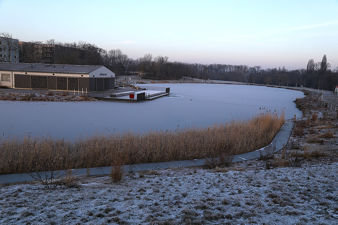 Zugefrorener Auenteich und glitzernde Eiskristalle