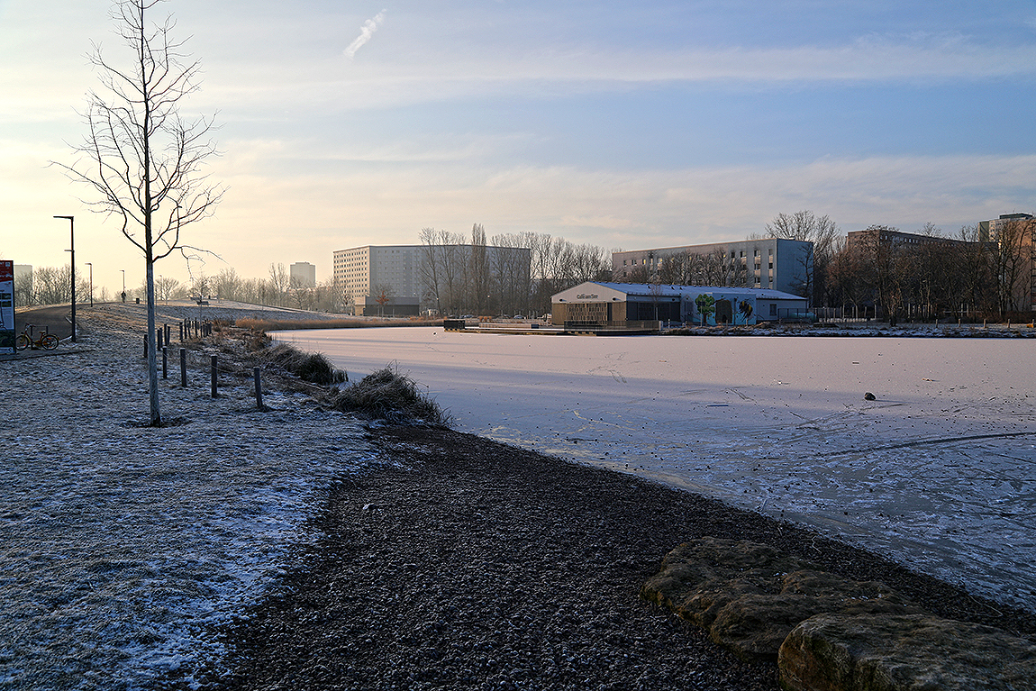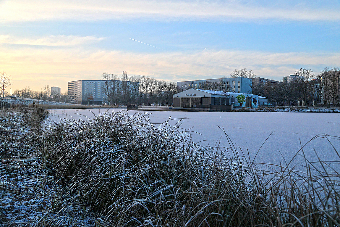 Das Wetter schafft faszinierende Anblicke. So (hunde)kalt es in diesen Tagen auch ist, wir haben uns nicht davon abhalten lassen, unsere regelmäßigen Streifzüge durch den Erfurter Norden zu machen. Dabei waren wir am gestrigen Vormittag ziemlich allein: Kaum Spaziergänger, keine Jogger, manchmal Hundebesitzer, die sich und ihren Vierbeinern flauschige Mäntel übergezogen hatten.
