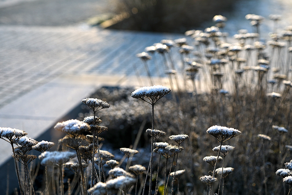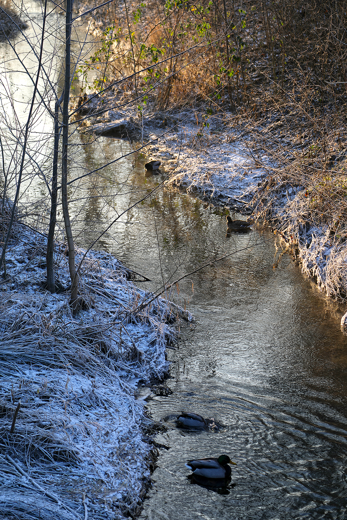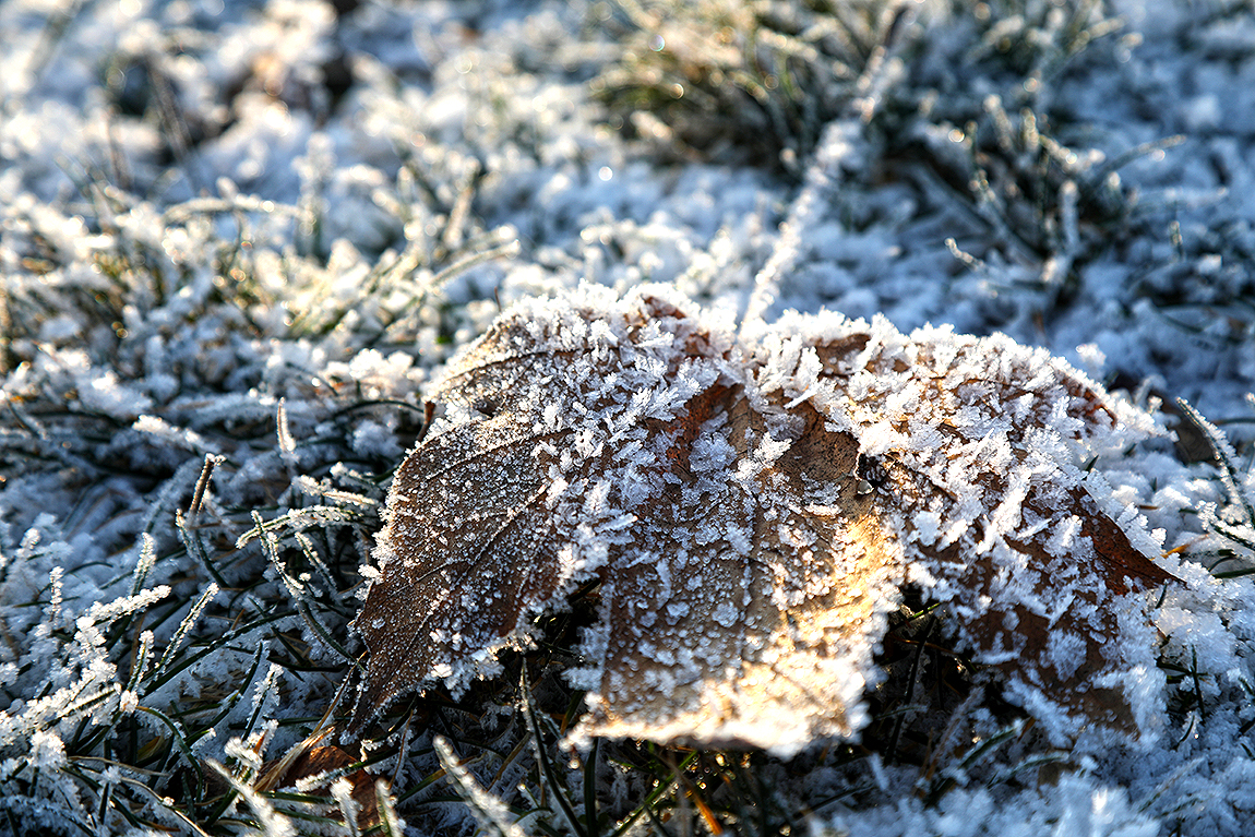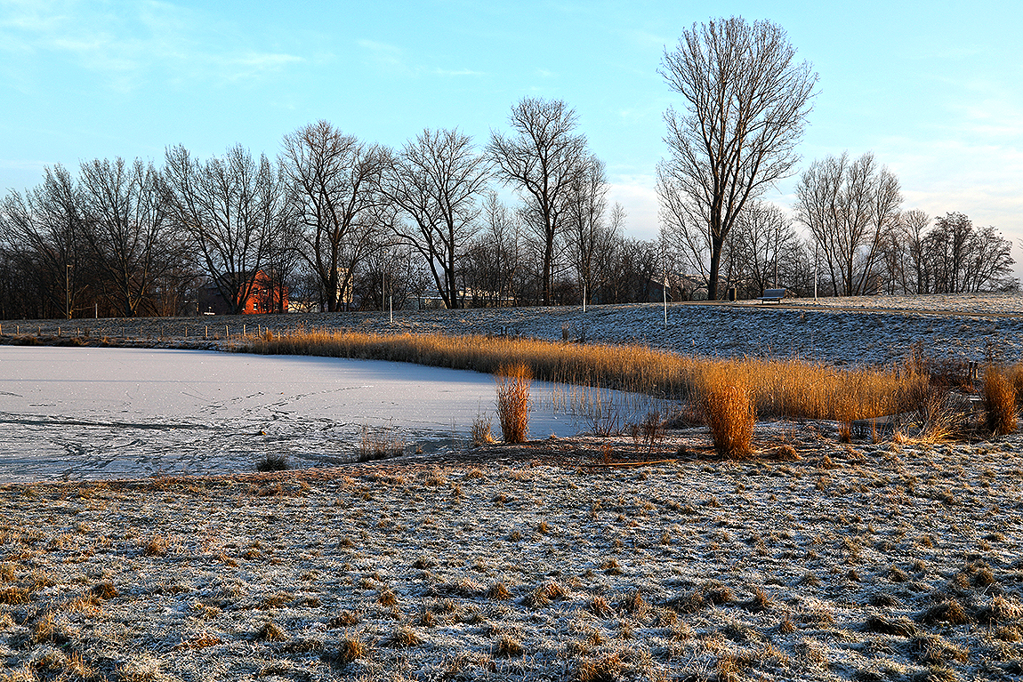Wer sich nach draußen wagt bei tiefen Temperaturen, kann viel Schönes entdecken: Vielleicht hatten wir es in der Vergangenheit verpasst, aber für uns war der komplett überfrorene Auenteich ein Novum, wenn auch die Eisschicht nicht kräftig und tragfähig ist. Eiskristalle glitzerten in der Wintersonne an den umstehenden Bäumen und Wiesen. Raureif trug zu dieser besonderen Atmosphäre bei, in der auch die Geräusche gedämpft schienen. Sollte es noch eine Weile kalt bleiben, dann sind diese sonnig-eisigen Wintertage für einen Spaziergang prädestiniert.