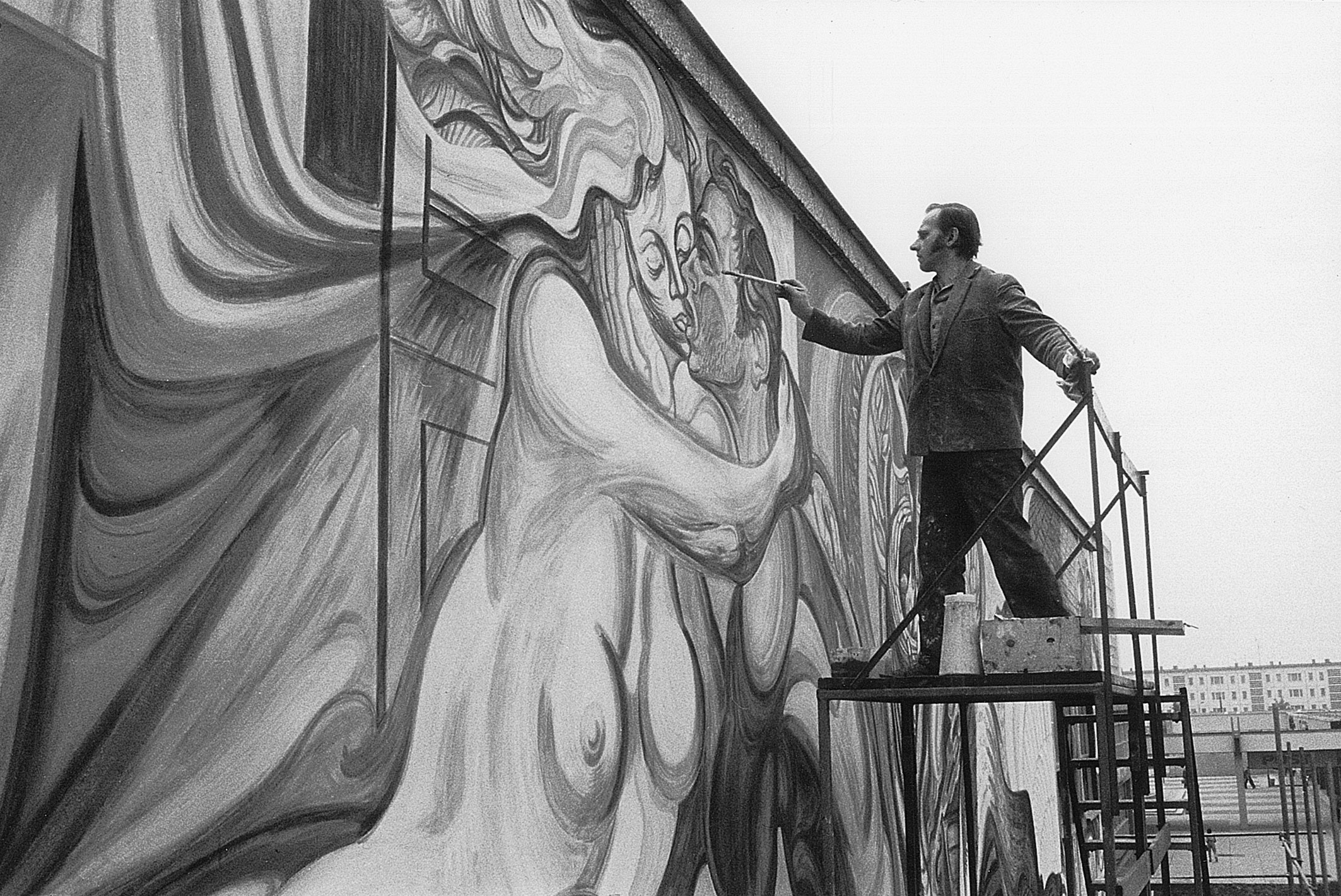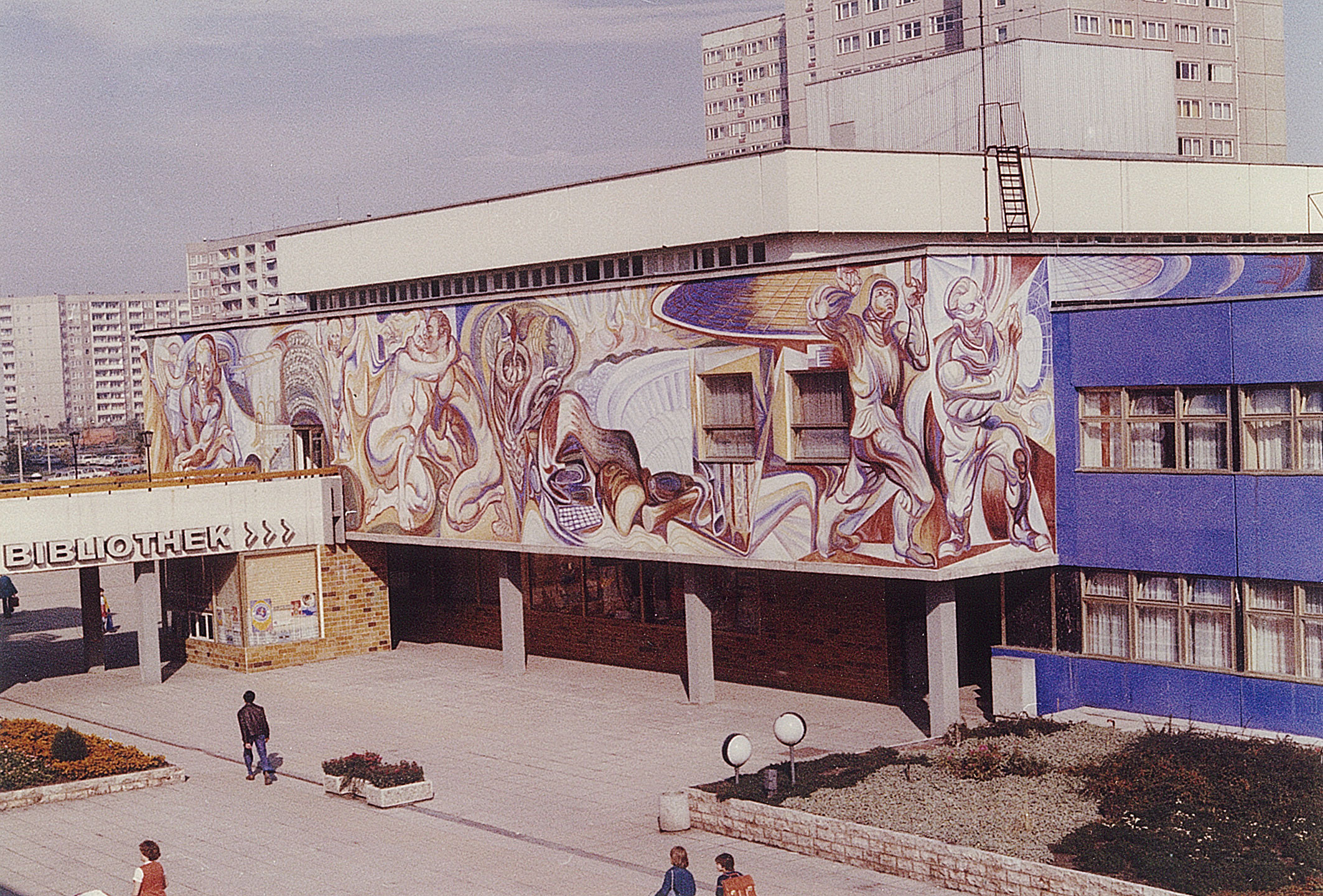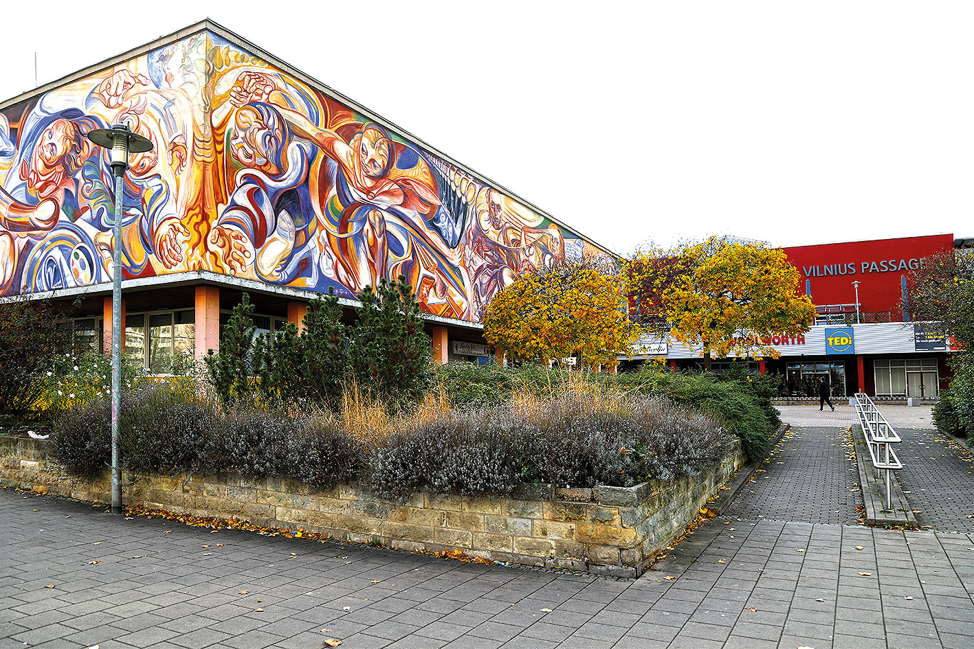 Im Dezember letzten Jahres, vor wenigen Wochen also, ist der Maler Erich Enge gestorben. Insbesondere mit seinem monumentalen Wandgemälde am Vilnius-Komplex „Sieg der Liebe über die Finsternis“ (1976) hat er das Straßenbild unseres Stadtteils mit geprägt. Verschiedene Szenen reihte der Künstler in seinem Bild aneinander, die durch eine besonders dynamische und unverwechselbare Linienführung verbunden sind.