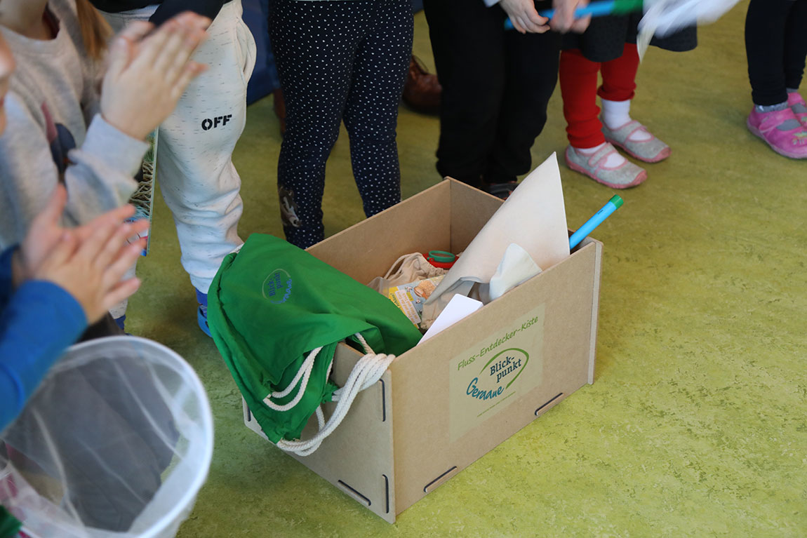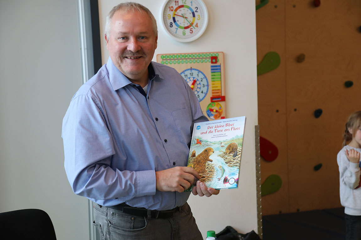 Präsident des Thüringer Landesamtes für Umwelt, Bergbau und Naturschutz Mario Suckert erklärt den Kindern den Inhalt der Entdeckerkiste