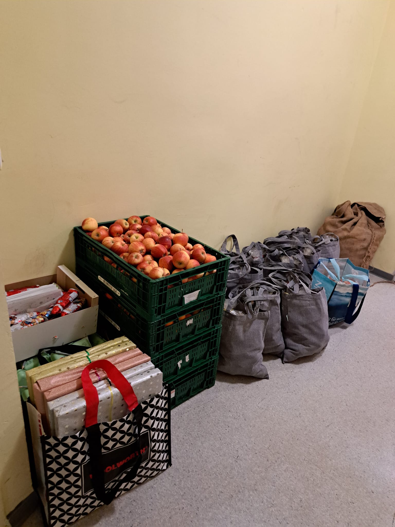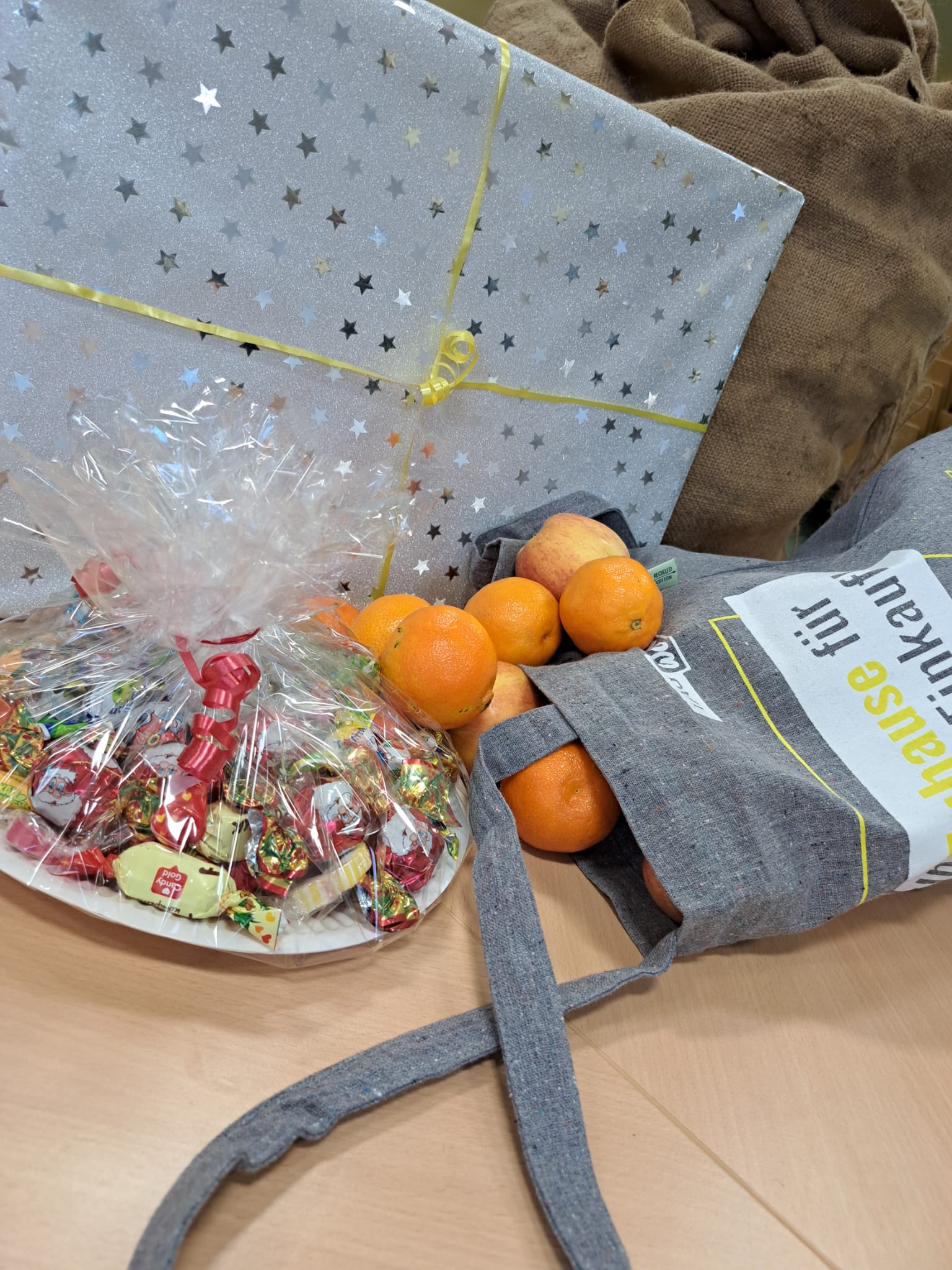 Am Montag war es nach fleißiger, intensiver Vorbereitung soweit: Letzte Absprachen wurden getroffen, kurz unterbrochen von einem Probealarm für die Schule. Davon ließen sich aber die Schulelternsprecher Annette Jebali und Oliver Oehler nicht aus dem Konzept bringen. Schnell waren die ersten Geschenke verteilt. Im Anschluss ging es gemeinsam mit der Schulleiterin Sabine Becher und einer Sponsorenvertreterin in die oberen Klassenstufen. Neben einem Beutel voll mit Äpfeln und Mandarinen erhielt jede Klasse ein gemeinsames Geschenk. Das konnte beim Naschen von Süßigkeiten ausgepackt werden.