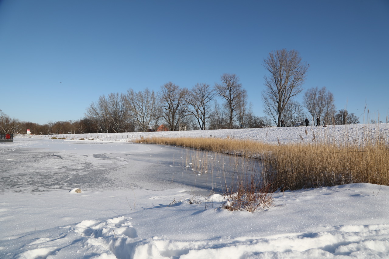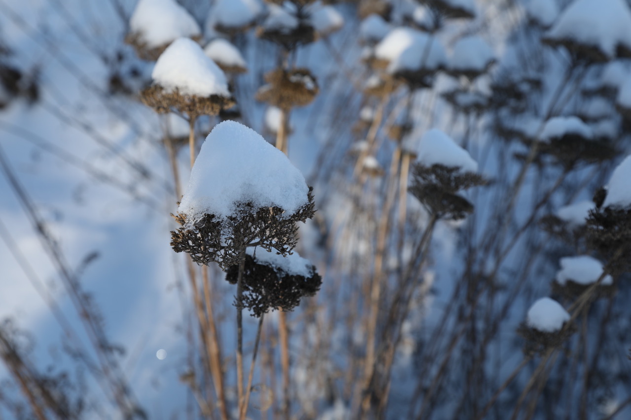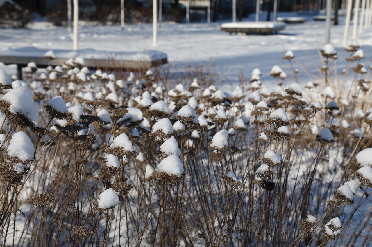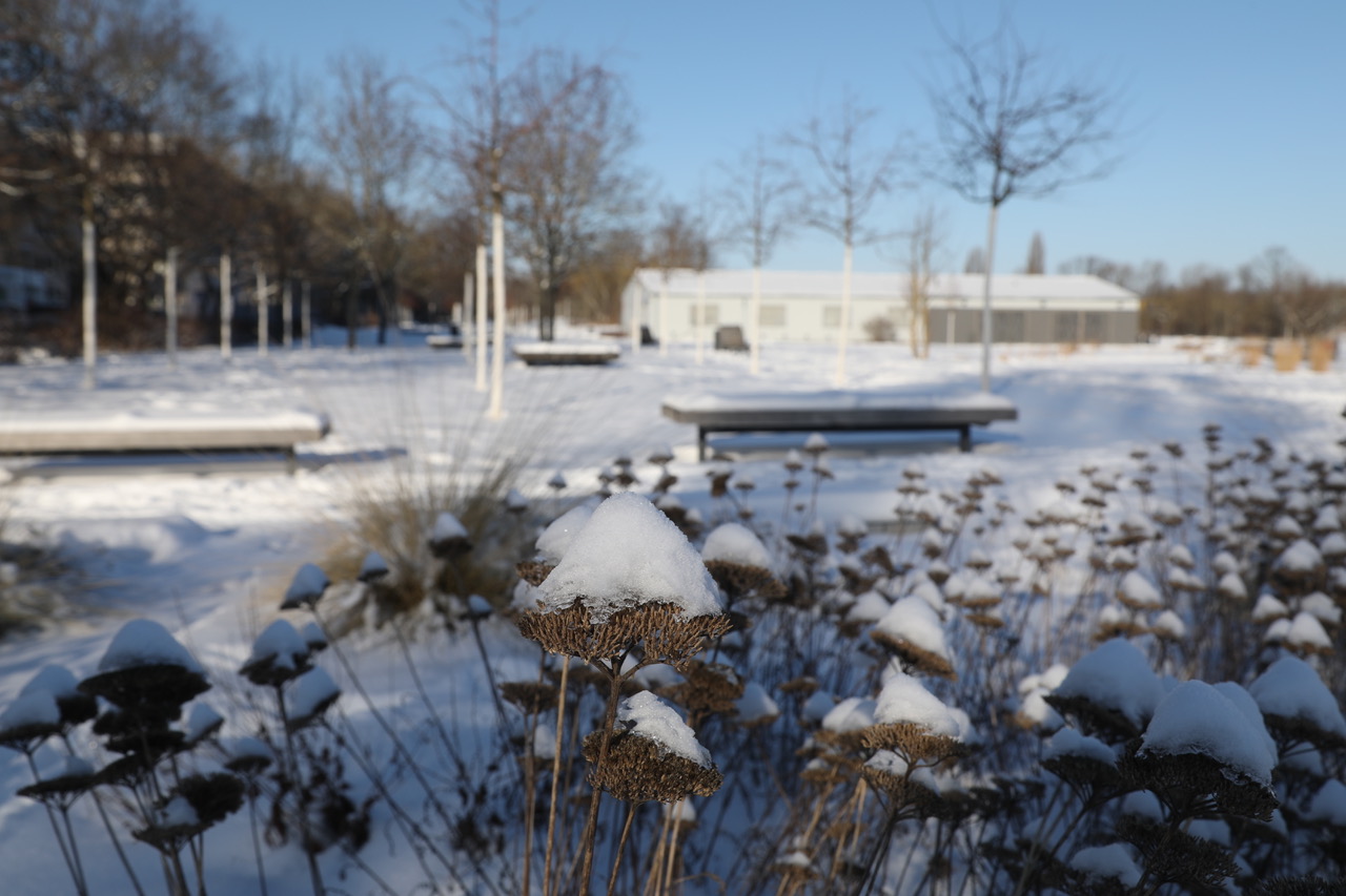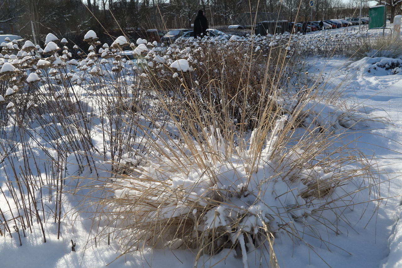 Trockene Staudenblüten trugen Schnee-Hüte, das Kneippbecken ruhte unter weißer Decke.