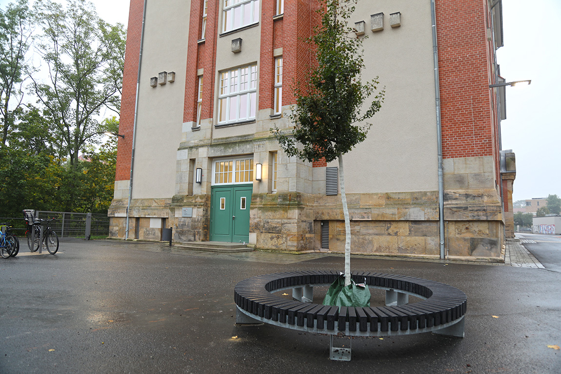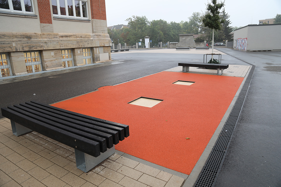 Allein 1,7 Millionen Euro flossen in die Außenanlagen. Es wurde ein ansprechender und multifunktionaler Außenbereich gestaltet, der Baumbestand weitgehend erhalten. Es wurden überall dort neue Bäume gepflanzt, wo es der Untergrund bau- und vegetationstechnisch erlaubte. Insgesamt gibt es auf dem Schulgrundstück nun 10 neue Bäume. Ein zusätzlicher Baum konnte unmittelbar neben der Schule gepflanzt werden. Weiterhin wurden über 1.000 m² neue Strauchflächen und Hecken angelegt. Neu verlegt wurden Gasleitungen, Telefonleitungen sowie Be- und Entwässerungsleitungen. Eine neue Beleuchtung wurde installiert. Es wurde ein Regenrückhaltebecken errichtet, dessen Oberfläche optisch ansprechend gestaltet wurde.
