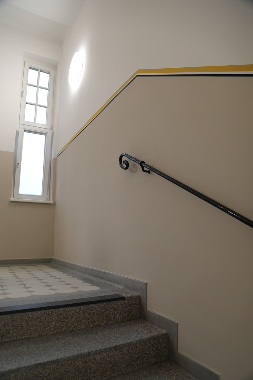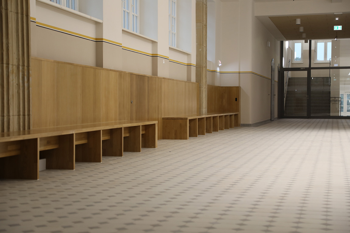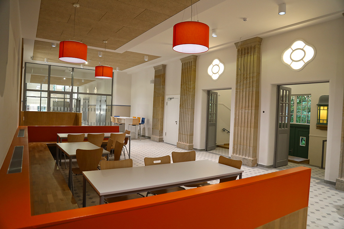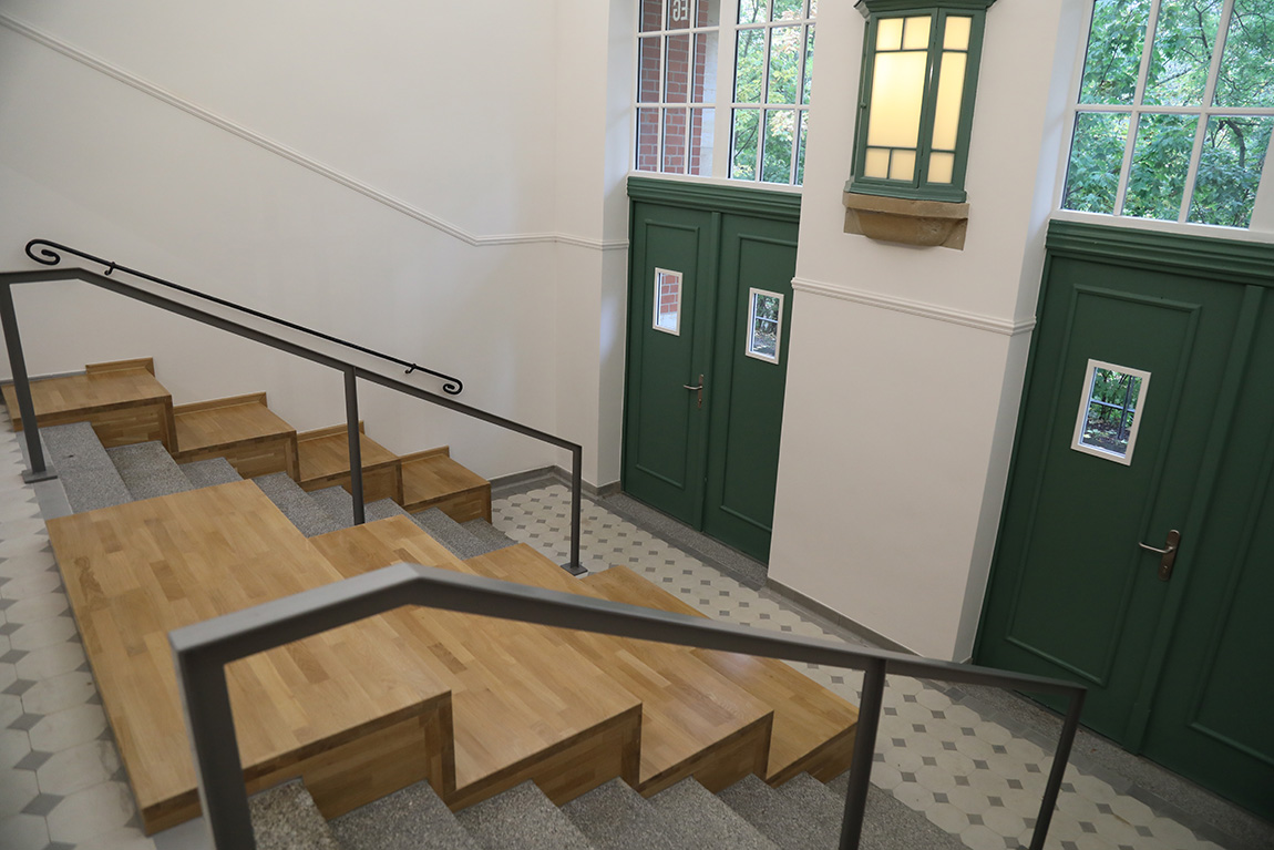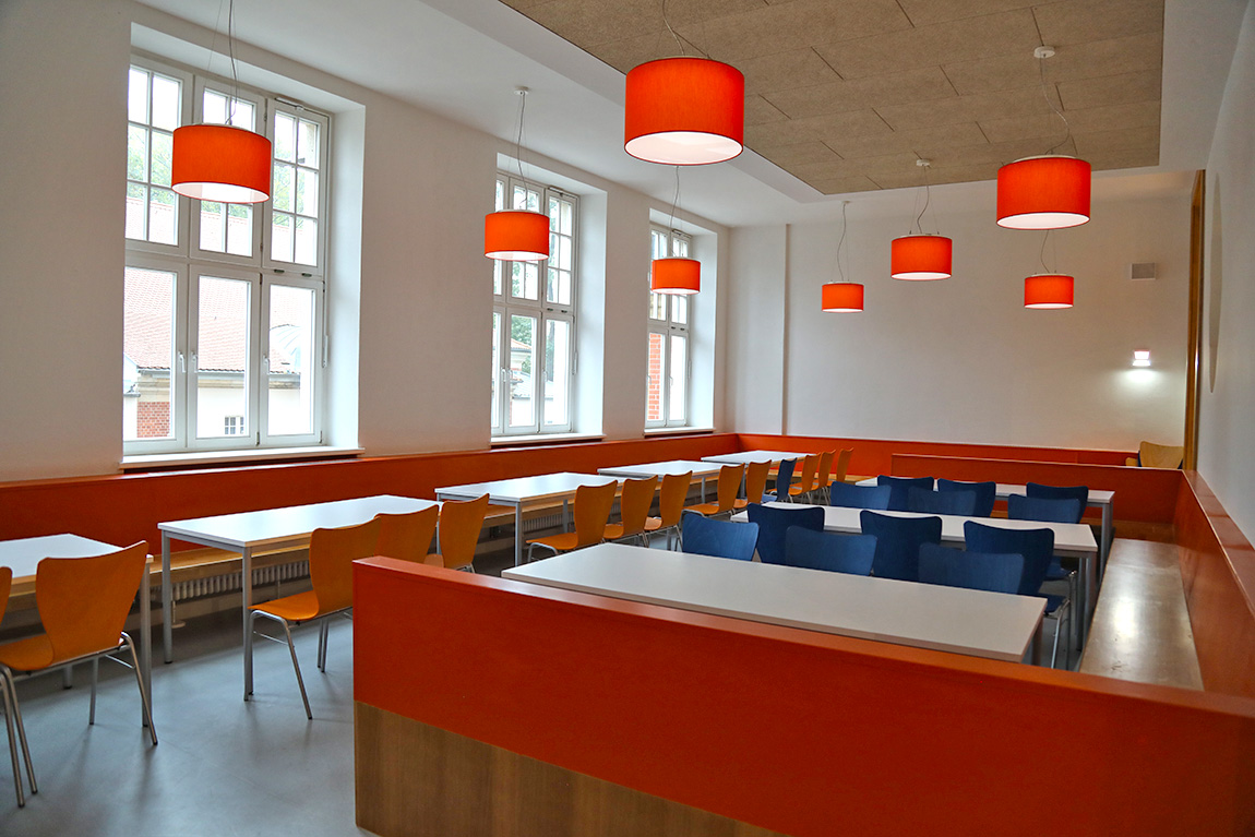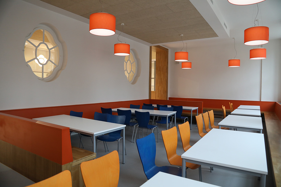 Hier werden nun die Klassen 1 bis 6 vierzügig unterrichtet. Im Erdgeschoss wurde eine großzügige Mensa und eine Ausgabeküche platziert und vom Erdgeschoss bis ins 3. Obergeschoss gibt es Klassen-, Fachunterrichts- und Kursräume, Toilettenanlagen für Jungen und für Mädchen sowie Pädagogen, behindertengerechte WC-Anlagen und Lehrerzimmer. Im Dachgeschoss schließlich konnte eine Aula neu eingerichtet werden. Die Nebenräume sind der Technik vorbehalten.