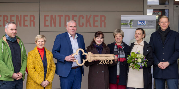Foto: OB Andreas Bausewein übergab Kita-Leiterin Nora Witthauer den symbolischen Schlüssel. Mit dabei Erfurts Baubeigeordneter Matthias Bärwolff (l.), Ortsteilbürgermeisterin Anita Pietsch (2.v.l.) und Vertreter vom Trägerwerk Soziale Dienste in Thüringen e. V.