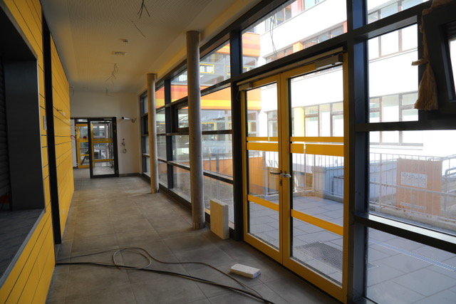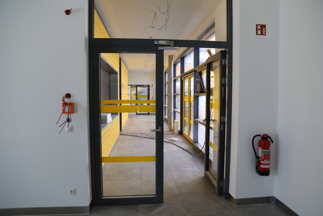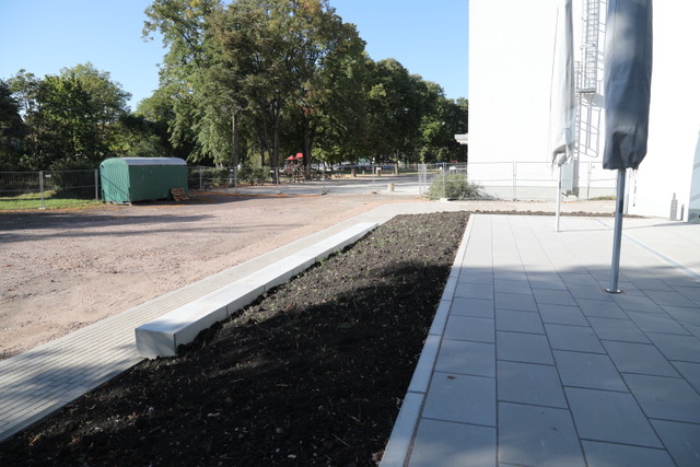 Auch die Beschattungsanlagen für die großen Glasfronten sind noch zu installieren. Die Sonnenschirme, die von fest ins Pflaster integrierten Hülsen im Außenbereich aufgenommen und im Außenbereich für Schatten sorgen werden, sind bereits geliefert. Die Rampen, die einen barrierefreien Zugang ermöglichen, sind erstellt, müssen aber noch angepasst werden. Einige kleinere, wohl auf jeder Baustelle vorkommende Mängel, sind bereits behoben worden.