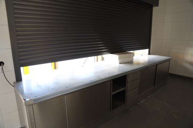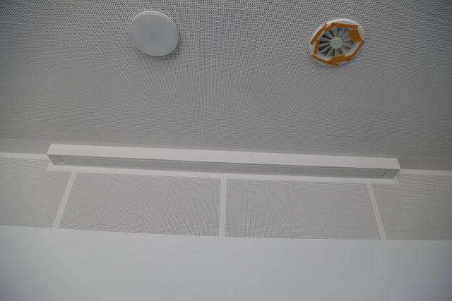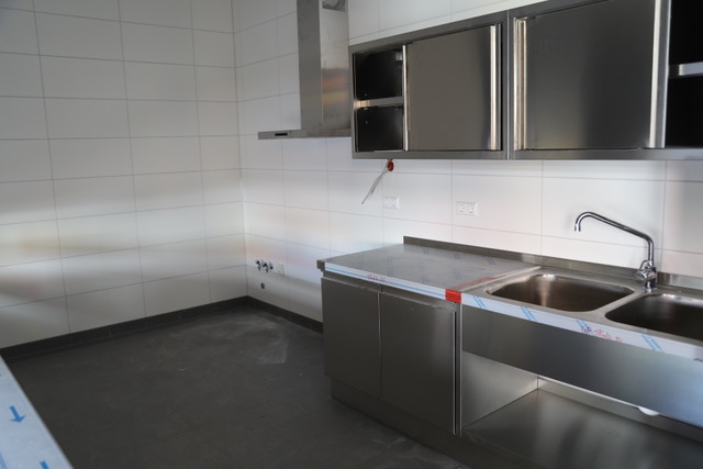 Inzwischen ist auch die Küche ausgestattet bis auf einzelne noch zu liefernde Komponenten. Ein Kühl- und Trockenraum wird die Versorgung der Kinder künftig unterstützen, auch sind noch Geräte zu liefern. Die drei Meter breite Essenausgabe ermöglicht es, drei Gerichte pro Tag den Kindern anzubieten. Auch die riesige Leinwand ist installiert, auf die Präsentationen und Filme projiziert werden können, freut sich Schulleiter Stietz.
